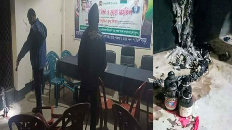 ফরিদপুরের আলফাডাঙ্গা উপজেলা বিএনপির কার্যালয়ে গভীররাতে পেট্রলবোমা বিস্ফোরণের ঘটনা ঘটেছে। ঘটনাস্থল থেকে অবিস্ফোরিত চারটি পেট্রোল বোমা উদ্ধার করেছে পুলিশ।মঙ্গলবার (২৫ ফেব্রুয়ারি) দিবাগত রাত ২টার দিকে উপজেলার সদরের হাসপাতাল রোডে অবস্থিত উপজেলা বিএনপির (একাংশ) অস্থায়ী কার্যালয়ে এ ঘটনা ঘটে।পুলিশ ও দলীয় সুত্রে জানাগেছে, মঙ্গলবার দিবাগত রাতে উপজেলা বিএনপির কার্যালয়কে লক্ষ্য করে বিপরীত দিক থেকে দুর্বৃত্তরা পেট্রলবোমা নিক্ষেপ করে। এ সময় একটি পেট্রলবোমা বিস্ফোরিত হলে কার্যালয়ের পশ্চিম দিকের জানালার একাংশ পুড়ে যায়। বিস্ফোরণের বিকট শব্দে আশপাশের বাড়ির লোকজন ও বাজারের নৈশপ্রহরীরা ঘটনাস্থলে ছুটে আসে। পরে তারা ফায়ার সার্ভিসকে খবর দেয়। ফায়ার সার্ভিসের কর্মীরা কার্যালয়ের তালা ভেঙে ভেতরে প্রবেশ করে আগুন নিয়ন্ত্রণে আনেন। খবর পেয়ে পুলিশ ঘটনাস্থল থেকে চারটি অবিস্ফোরিত পেট্রলবোমা উদ্ধার করে।