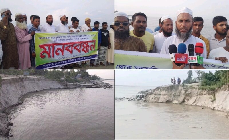 বেলকুচিতে নদী ভাঙ্গন প্রকল্পে দুর্নীতি: অসমাপ্ত কাজ সম্পন্ন করতে এলাকাবাসীর মানববন্ধন।